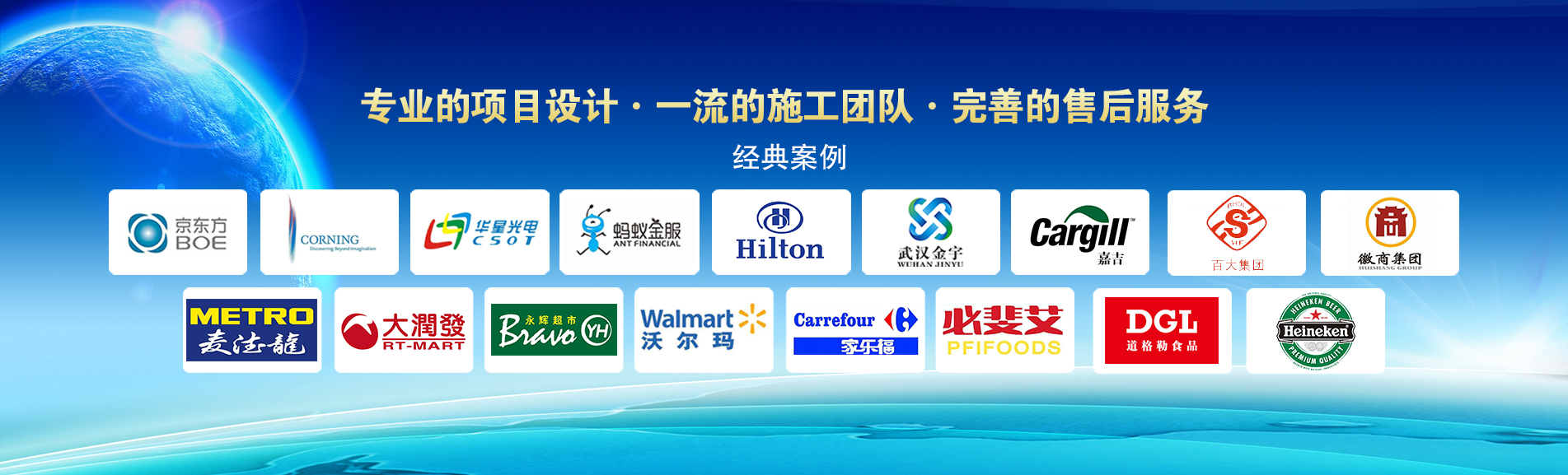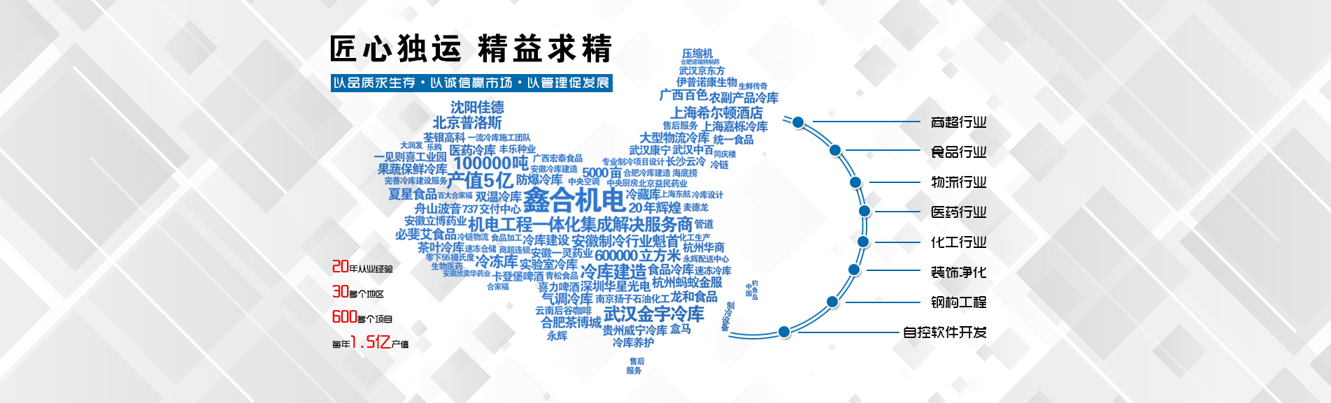 冷凍冷藏設備大型冷庫項目: 武漢中百物流冷庫(40000㎡)、蘇州、北京普洛斯大型物流庫(17000㎡)、沈陽佳德物流冷庫(20000㎡)、上海東航配餐物流庫(6000㎡)、杭州華商勾莊物流冷庫(24000㎡)、安徽安心蔬菜綠色食品冷庫(12000㎡)、武漢金宇冷庫(35000㎡)、必斐艾食品廠(14000㎡)、中國-東盟(百色)農產品交易中心冷庫物流工程(30000㎡)、遵鐵物流冷鏈物流區(qū)建設項目中心冷庫物流工程(16500㎡)、長沙云冷產業(yè)園冷庫物流工程(21000㎡)等;大型中央空調項目: 武漢康寧顯示玻璃廠廠房、武漢京東方模組廠房、武漢華星光電模組廠房、深圳華星光電模組廠房,杭州阿里巴巴辦公樓,舟山波音737機場辦公樓,南京江北能源站、上海金融大酒店等